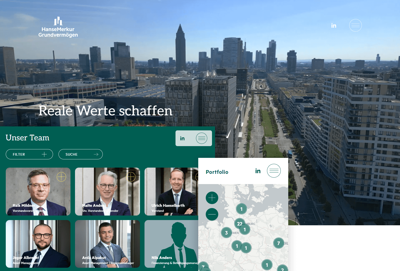 Für und mit der Agentur lab3 aus Hamburg, die für Konzept und Layout verantwortlich waren, haben wir den Relaunch der Internetseite für die HanseMerkur Grundvermögen AG umgesetzt. Die Internetseite enthält einige interaktive Elemente, z.B. für die Darstellung des Portfolios sowie eine Mitarbeiterdatenbank, die durch die Mitarbeiter gepflegt werden können.